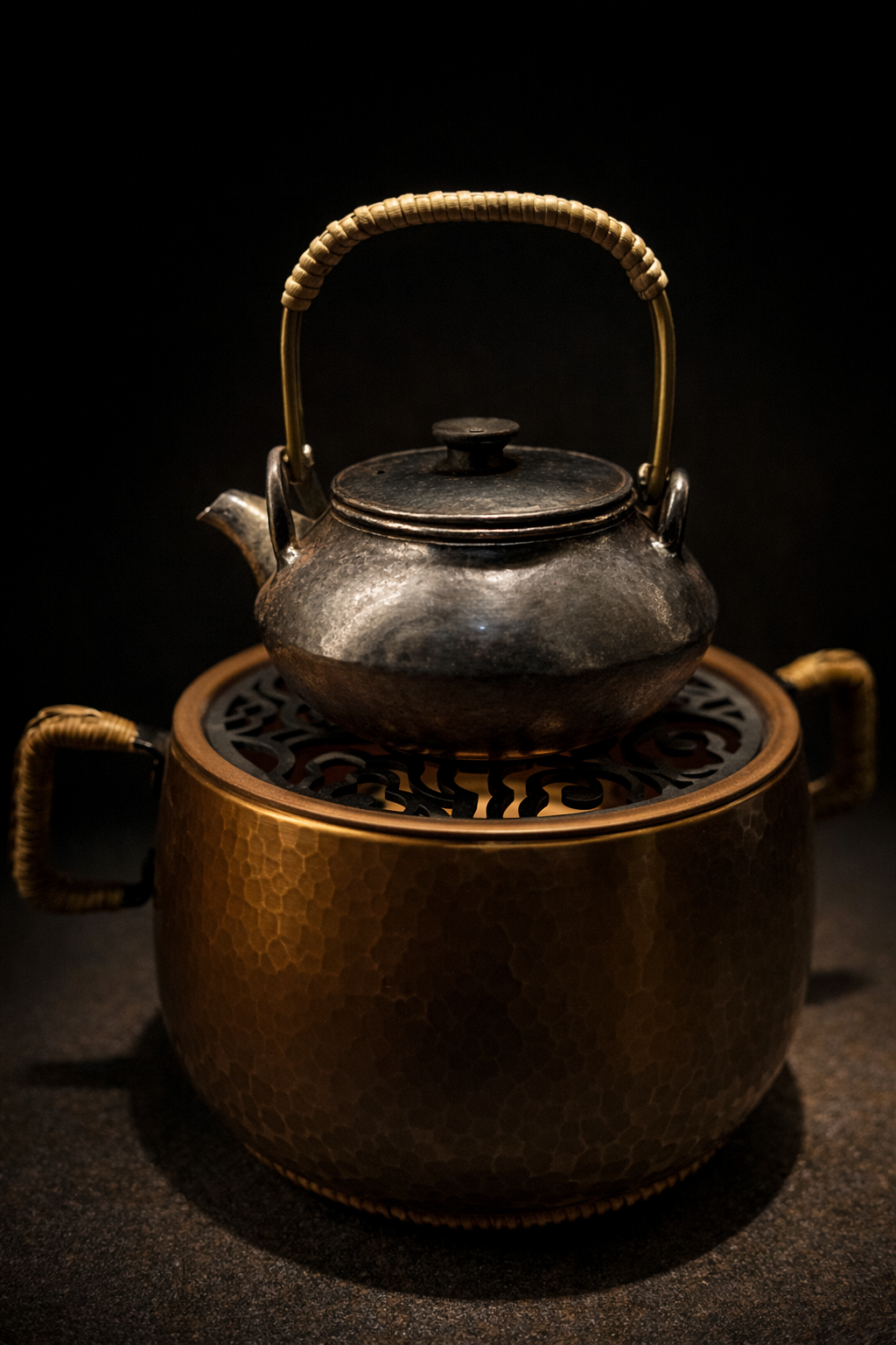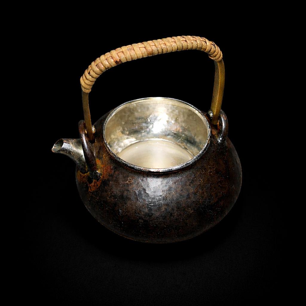 This compact teapot exemplifies a complex hybrid of materials and techniques. The vessel’s core is silver — chosen for its even thermal conductivity and subtle reflective quality — while the iron outer layer is forged over it to form a durable, heat-resistant exterior. Achieving a seamless bond between these dissimilar metals demands exacting control of temperature and force during forging, marking the object as the product of advanced traditional metalwork.
